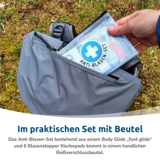 Der Stick und die Blasenstopper können sowohl prophylaktisch als auch bei den ersten Anzeichen von Scheuerstellen („Hot-Spots“) eingesetzt werden. Der Reißverschlussbeutel sorgt dafür, dass alles ordnungsgemäß verstaut und unterwegs schnell griffbereit ist.