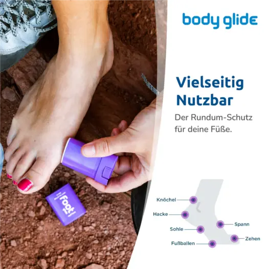 - Einfach auf die Fußhaut auftragen, besonders an Stellen, an denen Blasen oder Hot-Spots drohen.