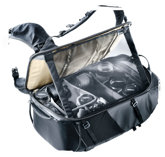Besonders clever: Ein transparentes Mesh-Gitter mit Klettverschlüssen lässt sich im geöffneten Hauptfach über das Fotoequipment spannen. Dadurch bleibt die Ausrüstung auch beim schnellen Zugriff vor Regentropfen und Schneeflocken geschützt.